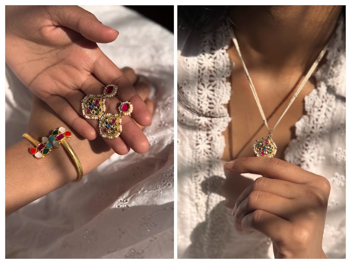 multicolor stone kundan on a silver alloy base with gold polish,