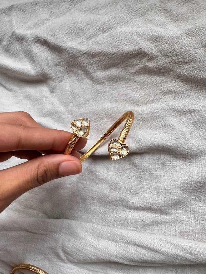featuring a pair of stone kundan heart motifs on a brass alloy base with gold plating.