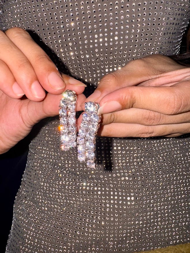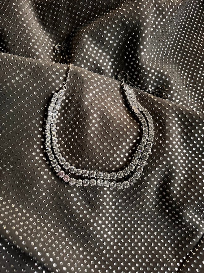 The Iris Necklace and Earring set feature double strands of high quality AD’s on a silver allloy base with silver plating.