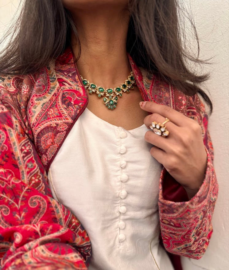 The 3-piece set features a silver alloy base with gold plating and zircon with green stones.