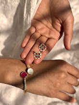red stone kundan floral motif pendant with faux pearls set on a