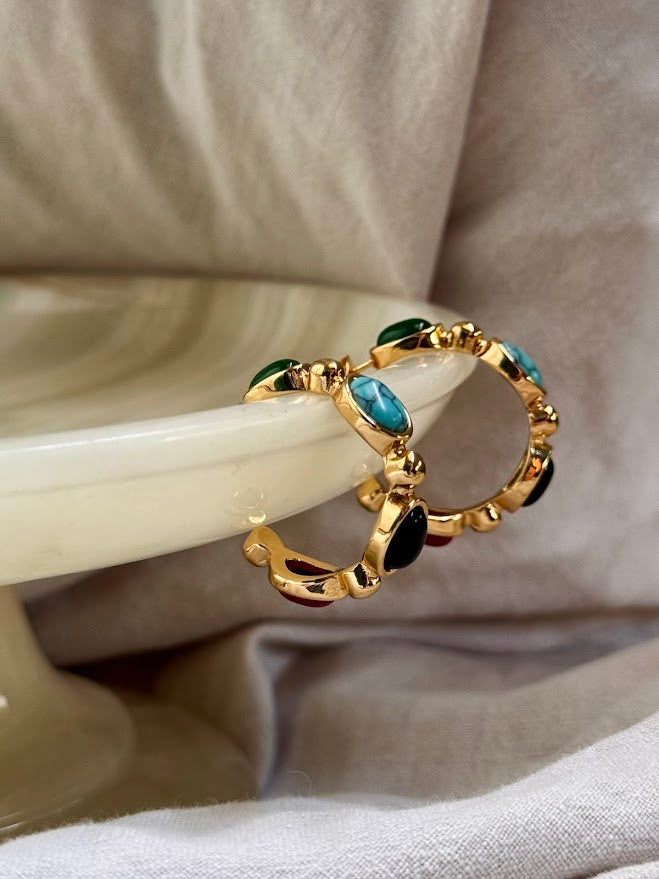 The Leela balis are hoops with multi-colored stones in an oval shape.These balis are anti-tarnish. Comes with pushback closure.