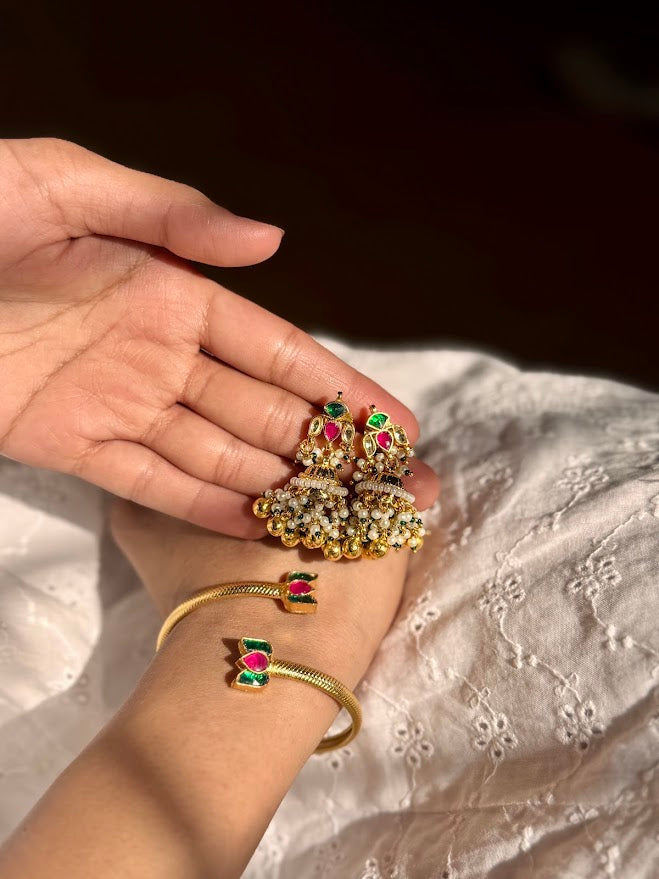 motifs , the crescent moon and the lotus in stone kundan on a silver alloy base with gold polish.This is a heavier pendant set as it features heavy Jhumkas as earrings in the same motifs.