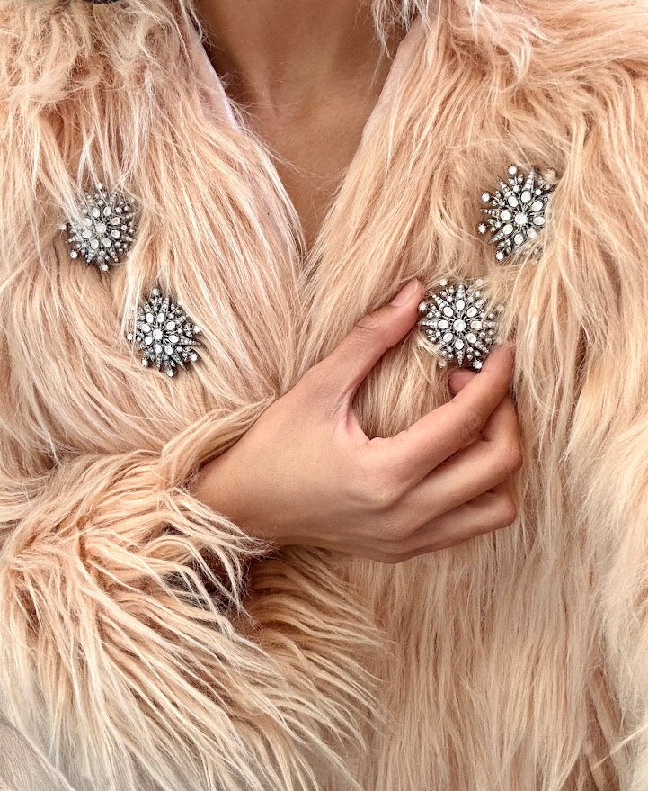 The Naintara brooch features a starburst design on a silver alloy base with silver plating and zircons. The brooch features a pin in the back.