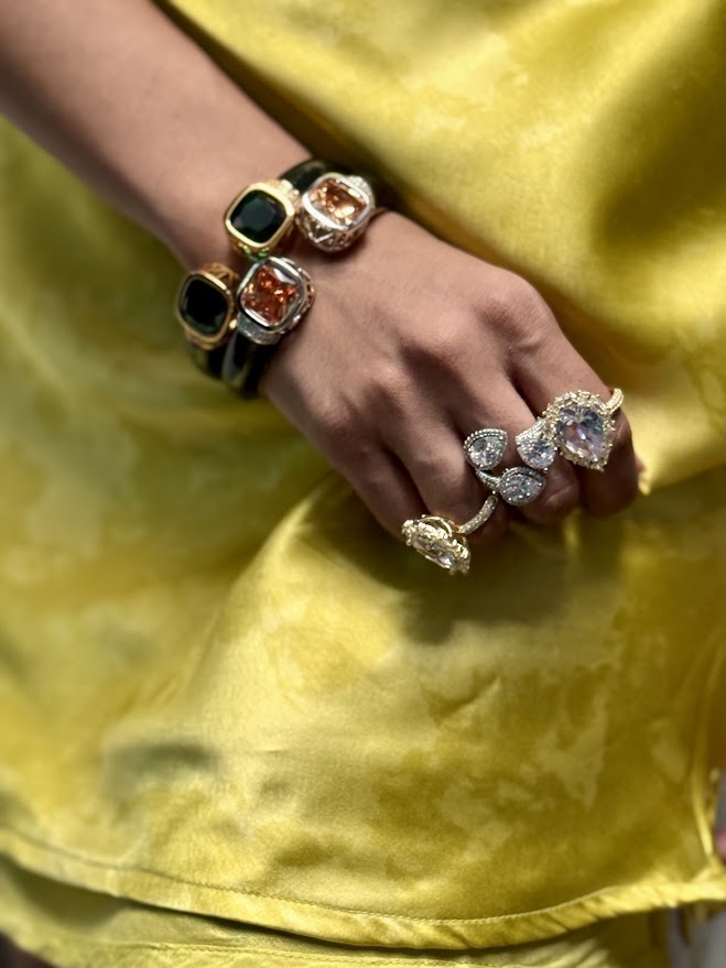 The Trishira Ring features 3-petal shaped AD's surrounded by smaller AD's . The ring is anti-tarnish and adjustable